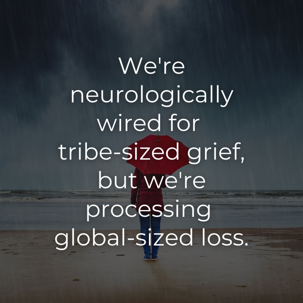 We’re the first generation to grieve in real-time with the entire planet. Through our screens, we witness losses happening thousands of miles away as if they’re in our living room. We’re neurologically wired for tribe-sized grief, but we’re processing global-sized loss.