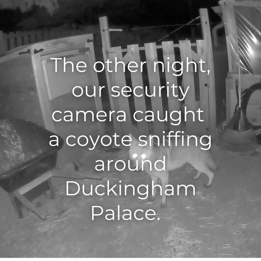 The other night, our security camera caught a coyote sniffing around Duckingham Palace. (Yes, that’s what we call our duck house. I never claimed subtlety was my strong suit.)