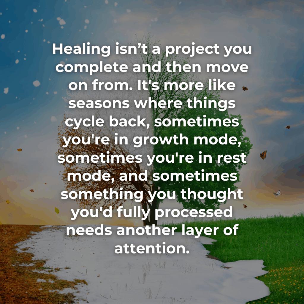 But the soul doesn’t work that way, and healing isn’t linear. Healing isn’t a project you complete and then move on from. It’s more like seasons where things cycle back, sometimes you’re in growth mode, sometimes you’re in rest mode, and sometimes something you thought you’d fully processed needs another layer of attention.